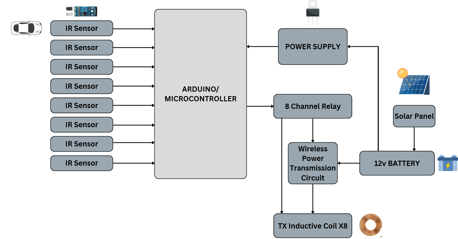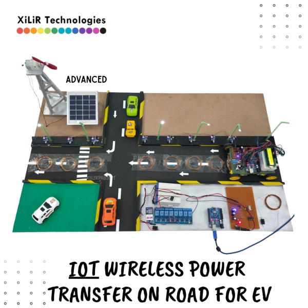 This project is a dual-integrated system featuring a Smart IoT-Based Wireless EV Charging Road and an IoT-enabled Electric Vehicle (EV) with real-time monitoring. The system showcases wireless energy transfer, vehicle detection automation, and remote data monitoring via ThingSpeak, powered by solar energy. The road is embedded with inductive coils, which transfer power wirelessly to electric vehicles. The system uses 8 IR sensors to detect the position of the vehicle, so only the coil directly under the car is activated—ensuring high energy efficiency. The electric car is designed to run on the wireless road charging system and includes a real-time onboard monitoring system using sensors and an ESP8266 Wi-Fi module to log data to ThingSpeak.