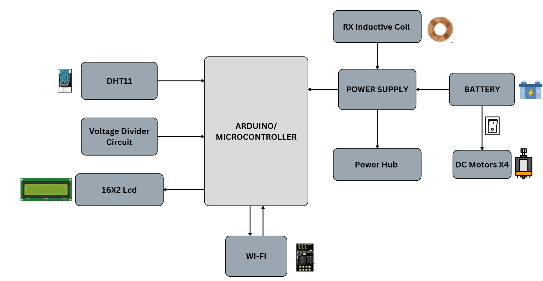 This project shows a dynamic wireless charging system for an Arduino-based EV car. 8 TX induction coils along a track create magnetic fields using pulse generators controlled by an 8-channel relay module. IR sensors detect the car’s position and switch the coils on and off as the car moves. RX coil on the car wirelessly picks up power, which is displayed on a 16×2 LCD. An ESP8266 Wi-Fi module and DHT11 sensor sends real-time voltage, temperature, and humidity data to a server, enabling remote monitoring and diagnostics of the car’s charging status and environmental conditions.
